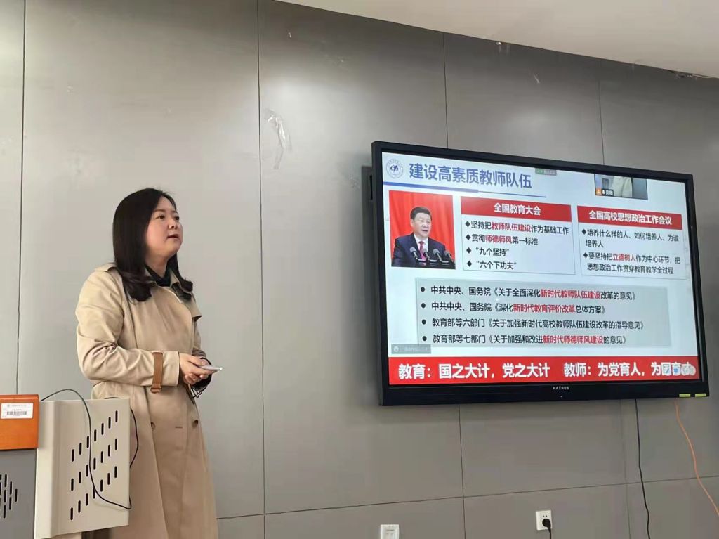 会议邀请了三位校机关部处领导做专题报告,分别是人事处/教师工作部李丹副部长做“做一名“四有”好老师”专题报告,研究生管理处王扬副处长做“精准发力,构建体系,提升研究生思政育人实效”专题报告,研究生院培养处蔡军副处长做“研究生培养全过程质量保障体系的系列文件制定(修订)情况介绍”专题报告。李丹副部长首先带领大家学习了习近平总书记关于高校教师队伍建设的重要指示精神,重点学习了习近平总书记对“好老师”的阐述,随后介绍了学校“立德树人奖”的设立和运行情况以及几位获奖教师的育人典范事迹,最后列举若干师德失范行为,并介绍学校师德考核工作安排。王扬副部长首先带领大家学习了中央对高校思想政治工作的要求,阐述了研究生导师的职责,随后介绍了我校研究生思政工作的整体情况和现状,最后重点讲解我校“三横三纵”学生工作体系、研究生导学关系建设总体方案及学校各部门协同联动工作方案。蔡军副处长介绍了2021年学校人才培养大会确定的今年两大任务:研究生全过程培养质量管理及改进研究生导学关系,随后介绍了研究生培养全过程质量保障体系的系列文件制定及修订工作进展,并对相关文件制度逐一做了要点解读,最后对学校后续相关工作安排做了介绍。