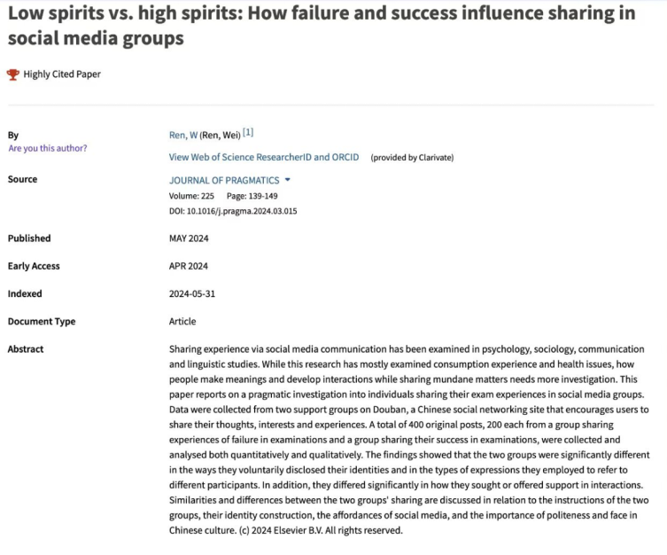 近日,据“基本科学指标数据库(Essential Science Indicators,简称ESI)”发布的最新数据显示,北京航空航天大学KY开元集团官网入口任伟教授发表于国际顶尖期刊《Journal of Pragmatics》(《语用学杂志》)的学术论文“Low spirits vs. high spirits: How failure and success influence sharing in social media groups”成功入选全球“高被引论文(Highly Cited Paper)”。