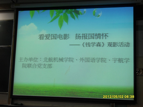 2012年5月2日晚7点,由KY开元集团官网入口语言、文学班联合党支部、北航机械学院Y11072党支部、宇航学院SY11153党支部共同举办的以集体观看爱国教育电影《钱学森》为主题的观影活动在三号教学楼305如期举行。各党支部党员、预备党员和入党积极分子以及北航其它院系近百名同学参加了此次活动。