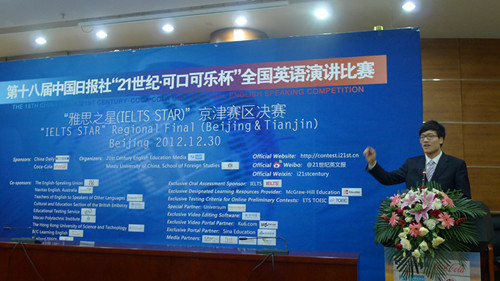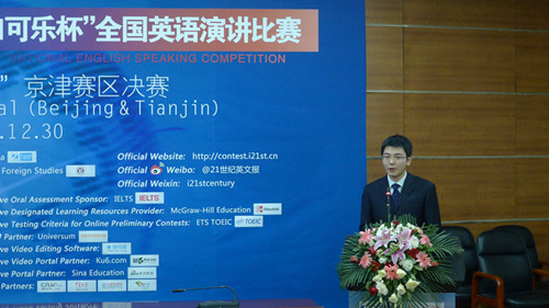 “21世纪杯”全国英语演讲比赛自1996年创办以来,已成为中国外语界最为权威的英语演讲比赛。它同时被指定为每年在英国伦敦举办的国际英语演讲比赛的中国区选拔赛,充分显示了大赛高层次的学术地位。本届大赛在互联网海选、校园选拔赛、地区决赛期间的演讲主题是My view on social networking,吸引了来自全国各地高校的上万名选手报名参赛。经选拔,全国17个赛区共有约400名优秀选手脱颖而出,代表其所在学校参加地区决赛。京津地区决赛为重中之重,云集了来自北京和天津地区的优秀选手,竞争十分激励。选手们从上午9点正式开始比赛,直到下午5点。比赛内容包括定题演讲、即兴演讲和现场问答三个环节,要求学生不仅要有优秀的演讲水平,还要有灵活的应变能力。